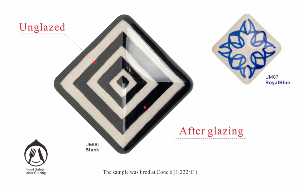 ●Fire directly or used with clear glaze to fire your piece. Firing range: Cone 05 (1046°C) to Cone 6 (1,222°C).